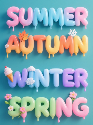 一组4个不同季节主题的3D立体字设计系列素材,保持与原图一致的超写实3D渲染风格、光滑塑料质感、渐变色彩运用和融化滴落效果,每个季节字("SPRING"、"AUTUMN"、"WINTER"、"SUMMER")搭配对应季节元素(春季花朵与绿叶、秋季枫叶与果实、冬季雪花与冰凌、夏季沙滩与贝壳),采用纯色背景(分别为嫩绿色、橙黄色、冰蓝色、粉红色),整体以规整网格布局排列,光影统一为柔和顶部光源,营造清新欢快的氛围,每个元素细节丰富,色彩和谐且具有季节代表性。