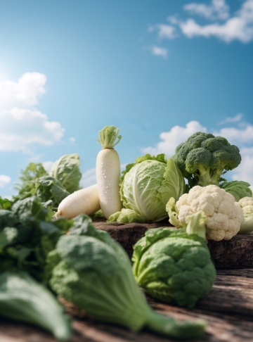 超写实风格的果蔬自然场景,阳光明媚的户外环境,前景中铺满新鲜饱满的各色蔬菜:鲜红的甜椒、圆润的樱桃番茄、橙色的胡萝卜、绿色的黄瓜和西葫芦、白色的蘑菇与花椰菜,还有翠绿的生菜和豆角,所有蔬果带着晶莹的露珠,细节清晰可见,表面纹理质感真实。背景是虚化的绿色植物和蓝天白云,整体色调鲜亮明快,充满生机与活力,光线从上方照射下来,形成柔和的阴影,营造出清新自然、健康有机的氛围,构图饱满,层次分明,色彩丰富和谐,展现出果蔬的新鲜与自然之美。