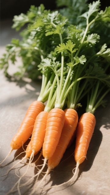 一束新鲜的胡萝卜,橙黄色的根部带有自然的纵向纹理,顶部是翠绿的、带有细小锯齿状叶子的茎叶,胡萝卜根部带有白色的须根,它们被整齐地摆放在一个表面上,光线从侧面照射过来,在胡萝卜上形成了明亮的高光和自然的阴影,整体呈现出清晰、细腻的质感和真实的摄影效果,温暖的色调,高清晰度,细节丰富。