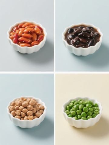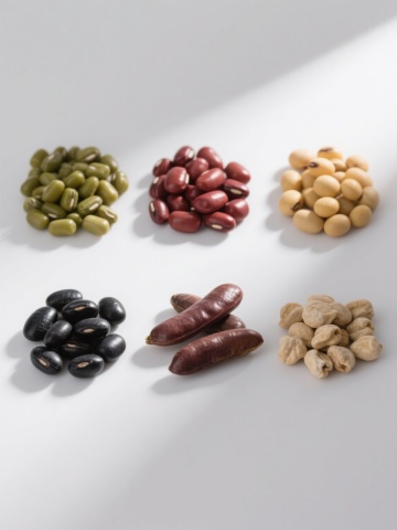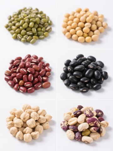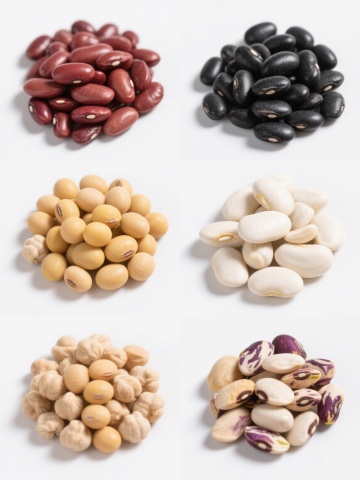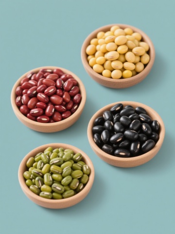 纯白纯色背景,超写实摄影风格,光线柔和明亮从上方45度角照射,形成清晰自然的阴影,展现黄豆圆润饱满的形态、淡黄色的自然色泽和表面细微的纹理质感,阴影细节丰富且自然,整体画面干净简洁,主体突出。画面被等分为四个相同大小的方格,每个方格中分别展示一种完全不同造型的黄豆元素内容:第一个方格中是一碗装满并溢出的黑色陶碗中的黄豆,碗沿外散落几颗黄豆;第二个方格中是几颗黄豆被细线串成的简约风铃造型,下方悬挂一颗单独的黄豆;第三个方格中是黄豆排列成圆形笑脸图案,用两颗黑豆点缀成眼睛;第四个方格中是黄豆从上方倾倒而下形成流动的弧线,底部散落少量黄豆。四个方格内的黄豆元素均保持超写实摄影的视觉风格、光线处理、色彩质感和阴影表现,整体画面规整排布,形成系列素材集合,无任何文字、LOGO、二维码及多余元素。