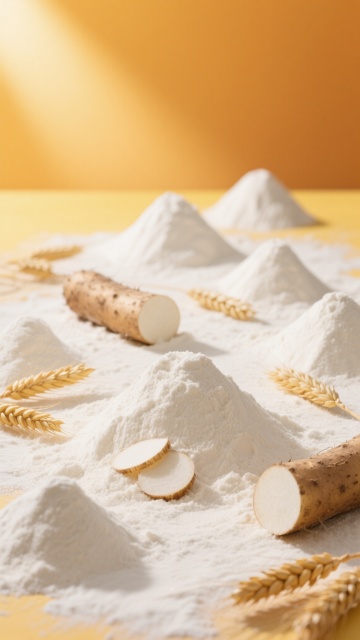 高质感食品摄影风格,纯净白色面粉塑造多座形态自然的“面粉山丘”,表面呈现柔和的颗粒质感与细腻纹理,画面中央偏下位置放置一个简约的白色陶瓷小碗,碗内堆满蓬松的面粉,碗口边缘有少量面粉自然洒落,背景为温暖的浅棕色渐变,顶部中央有一束柔和的金色逆光光源,光线穿透扬起的面粉颗粒形成梦幻的丁达尔效应,散落的面粉在空中划出轻盈的轨迹,地面散落几颗饱满的金黄色麦粒作为点缀,整体色调以纯净的白色和温暖的米黄色为主,光影对比柔和,营造宁静、高级且富有质感的氛围,突出面粉的天然纯净与细腻特性,高清晰度,专业美食摄影布光,柔和阴影,细腻质感表现。