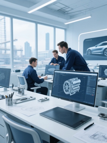 现代科技感十足的汽车设计工作室场景,明亮通透的空间,柔和的白色与蓝色主调,专业设计人员在工作台前专注工作,电脑屏幕上显示着精密的汽车发动机3D模型设计图,工作台整洁有序,摆放着设计图纸、专业文具和咖啡杯,背景中可见先进的设计设备与团队协作氛围,整体呈现高效、专业、未来感的工作环境,光线柔和均匀,细节清晰,质感真实,营造出创新科技与专业严谨并存的氛围。