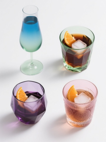 一组6个完全不同的精美鸡尾酒饮品系列素材集合,每个鸡尾酒均使用不同色彩的透明玻璃杯盛装,内含色彩各异的渐变液体、大块冰块、新鲜水果片和绿色薄荷叶装饰,背景为纯色,整体采用高写实摄影风格,光影清晰,细节丰富,玻璃杯通透有光泽,液体气泡自然,水果新鲜饱满,6个元素规整排布,保持一致的构图和高品质视觉效果,画面整体色彩变换多样但每个元素风格统一。