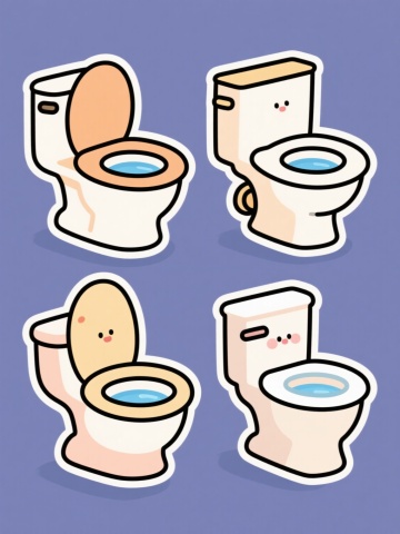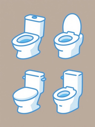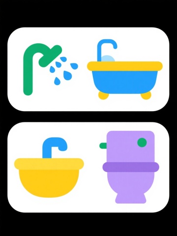 一组四个规整排布的浴室主题图标,每个图标均为简洁的线条风格,轮廓为黑色实线,内部填充不同的柔和纯色背景,保持相同的圆形边角和扁平化设计语言。第一个图标是蓝色浴缸配粉色毛巾和黄色水龙头,第二个图标是绿色洗手池配白色肥皂和橙色牙刷,第三个图标是紫色马桶配蓝色卷纸和绿色清洁剂,第四个图标是橙色淋浴喷头配紫色浴帘和黄色防滑垫,所有元素均采用相同粗细的线条绘制,整体色彩明快协调,形成统一的浴室用品系列素材集合。