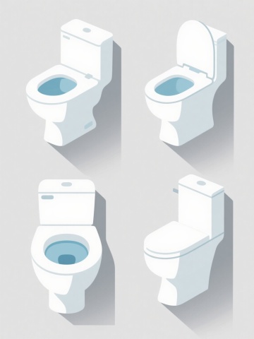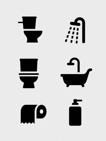 极简主义风格卫生间标识系列,纯白纯色背景,六个完全不同造型的卫生间元素图标规整排布。每个图标均采用黑色剪影式设计,保持简洁的线条感和符号化特征,包含马桶、洗手池、淋浴喷头、浴缸、卫生纸、洗手液等核心卫生间元素,每个图标造型独特且识别性强,整体布局采用2x3或3x2的网格状规整排列,视觉上保持高度统一的极简美学风格。