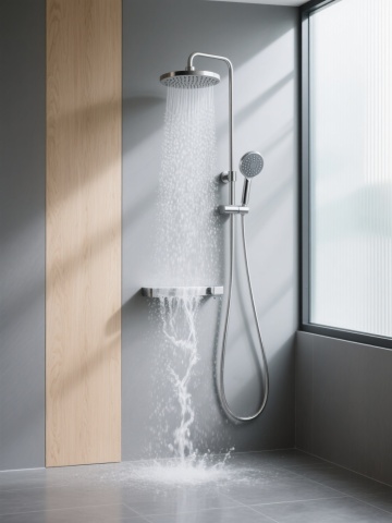极简主义风格浴室,整体以纯净的白色为主色调,搭配温暖的原木色人字拼地板,营造出明亮、洁净、宁静的氛围。柔和的自然光从画面外洒入,在白色墙面上形成微妙的光影过渡,光线均匀柔和,阴影细节自然。空间布局改为开放式淋浴区与独立式浴缸分区设计,浴缸更换为带有金属支架的椭圆形亚克力材质,置于房间中央位置,旁边增设一个原木色置物架。墙面采用大块哑光瓷砖铺设,局部嵌入浅灰色石质壁龛用于收纳洗漱用品。悬挂式白色洗手台下方设计成开放式储物格,搭配黑色金属水龙头和圆形镜子。天花板安装两盏黑色半球形吊灯,提供主要照明。浴室内摆放简约线条的原木色收纳柜和绿植装饰,毛巾和洗漱用品保持整齐摆放,整体视觉层次分明,信息传达简洁高效,符合现代都市人群对简约生活美学的追求。