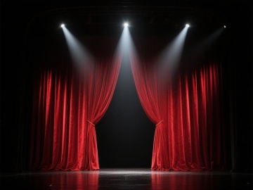 红色天鹅绒剧院舞台幕布,中央对称向两侧拉开形成深邃入口,顶部聚焦式聚光灯投射出强烈光束照亮幕布纹理,营造出神秘庄重且充满期待感的戏剧氛围,幕布褶皱自然垂坠富有丝绸光泽,背景为纯黑色增强明暗对比,舞台地面反射微弱光线呈现光滑质感。