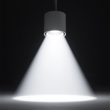 极简风格的射灯设计,黑色背景中,一盏筒形射灯从顶部中央位置射出明亮的白色光束,光线呈锥形向下扩散,边缘带有柔和的渐变光晕,光束内部有细微的光线层次感,射灯灯口为圆形,边缘光滑,整体画面营造出简洁、聚焦、专业的照明氛围,光影对比鲜明,突出射灯的照明效果和现代感。