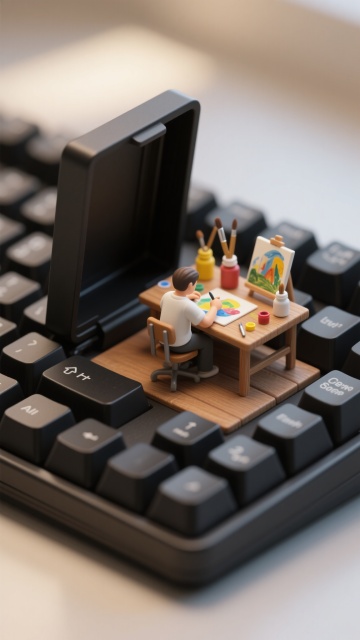 3D渲染风格,超写实微缩场景,黑色机械键盘上一个打开的键帽内部,一个穿着白色上衣的小人坐在木质工作台前专注地进行创作,工作台摆放着颜料瓶、画笔和画作,整体采用柔和的中性色调,光线从上方柔和照射,形成清晰的高光和自然阴影,展现出细腻的材质纹理和精致的空间层次感,营造出宁静而富有创意的氛围,具有极强的视觉冲击力和细节表现力。