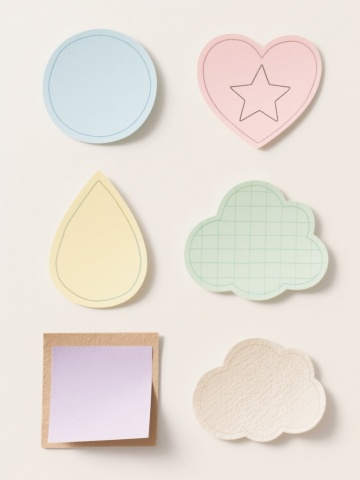 手绘风格便签组合,六个完全不同形状的便签(圆形、方形、心形、星形、水滴形、云朵形),每个便签拥有独特配色(如浅蓝、淡粉、鹅黄、薄荷绿、浅紫、米色)和不同材质质感(粗糙牛皮纸、光滑卡纸、半透明硫酸纸、网格纸、条纹纸、带纹理的棉纸),整体呈上下两行整齐排列,浅色背景,便签边缘有自然手绘线条感,部分便签带有轻微阴影增加立体感,无任何文字和二维码。