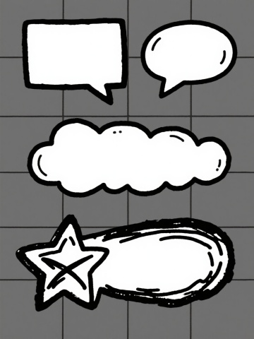 一组4个不同造型的卡通风格对话气泡系列素材,每个气泡都保持相同的手绘线条风格、黑色描边、白色填充和黄色星星装饰元素,气泡内容为空,背景为纯色,整体呈规整排布,每个气泡造型独特,有的像云朵带星形光芒,有的呈圆形带放射线条,有的是方形带星形点缀,有的为不规则形状带星星装饰,所有元素保持一致的卡通手绘风格和色彩搭配。