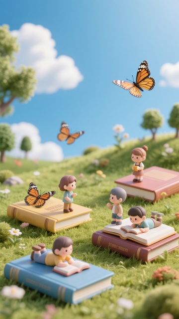 一套6个规整排布的卡通儿童系列插画,整体采用统一的明亮纯色背景(非原图像色彩),保持原图像的可爱Q版手绘风格,圆润的线条,柔和的渐变色彩,高光和阴影的细腻处理,以及简洁的构图。每个画面中都有一个穿着校服(白色上衣、蓝色领巾、不同颜色短裤/裙子)的亚洲儿童,动作各不相同:第一个孩子戴着黄色帽子正在专注地看书,第二个孩子坐在书桌前认真写作业,第三个孩子背着书包准备上学,第四个孩子张开双臂欢呼跳跃,第五个孩子正在欢快地跑步,第六个孩子抬脚用力踢着足球。每个孩子都有着大大的眼睛,灿烂的笑容,周围点缀着几片轻盈的叶子,整体氛围活泼、阳光、充满童真。所有元素排布整齐有序,形成一个和谐统一的系列素材集合。