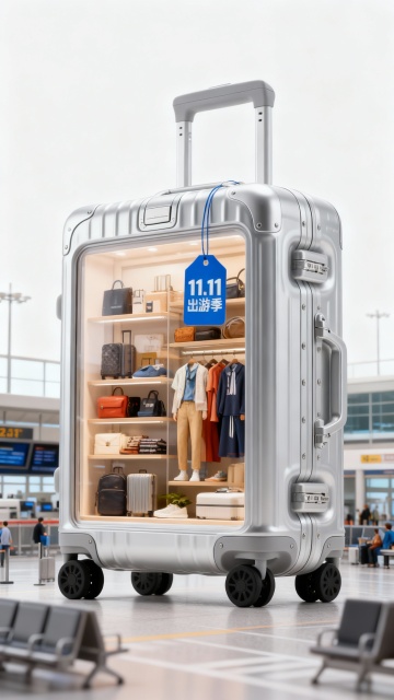 未来感3D风行李箱,透明玻璃门内陈列精致服饰,金属质感搭配虚拟现实场景,展现科技与时尚融合的11.11出游季潮流设计。