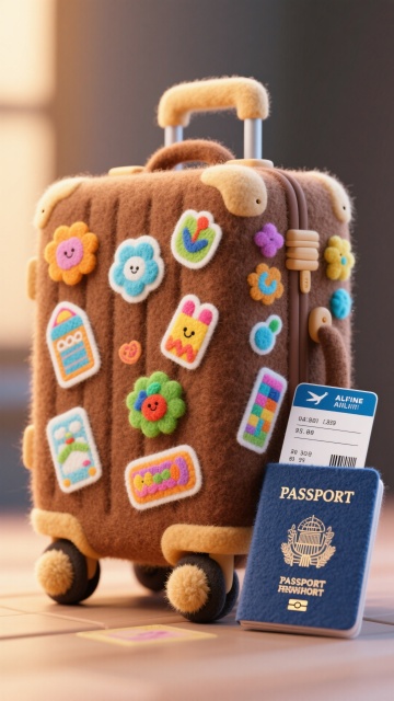 毛绒行李箱贴满可爱贴纸,搭配护照,营造出欢乐的出行氛围。