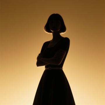 金色渐变背景下的女性剪影,双臂交叉站立姿态,短发造型,身着现代感连衣裙,裙摆呈优雅A字轮廓,腰部有精致收腰设计,整体轮廓线条流畅,光影过渡自然柔和,营造出自信从容的氛围,剪影边缘带有轻微的发光效果,画面简洁大气且具有时尚感。