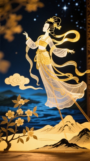 剪纸风与皮影艺术交融,古典美人月下轻舞,光影交错间尽显中式浪漫与静谧唯美感。