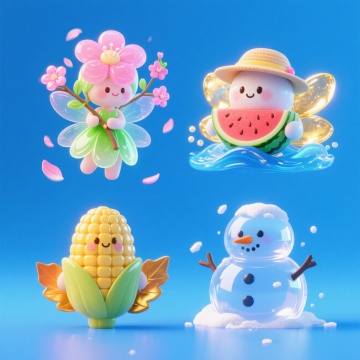 软3D风格的可爱拟人水果与兔子,融合粘土质感与梦幻色彩,呈现清新卡通感,呼应秋天的节日氛围。