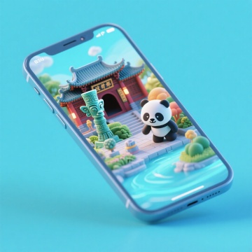 软3D风微缩艺术,可爱熊猫跃出手机屏,融合三星堆与古建筑,清新梦幻的卡通场景,传递传统文化趣味。