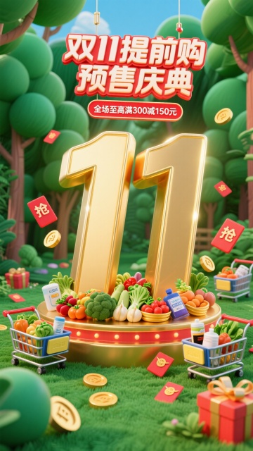 软3D风格的卡通场景,拟人化卷心菜角色萌趣十足,搭配明亮色系与礼物盒造型店铺,营造出可爱、喜庆的双11促销氛围。