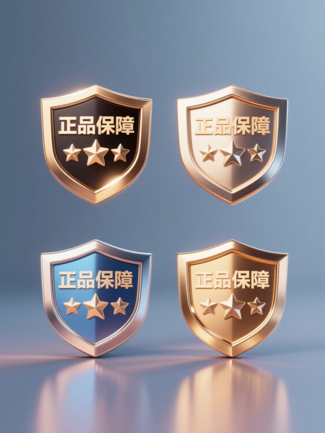 一组4个不同配色、不同样式、不同材质的徽章设计,每个徽章均为盾形轮廓,内部包含"正品保障"四个汉字和三颗五角星元素,整体呈现3D质感,具有光滑的金属光泽和高光效果,色彩搭配和谐,光影过渡自然,设计简洁大方,适合作为促销或品质保证标识使用
