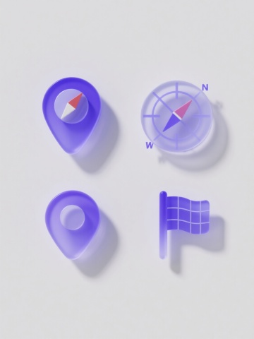6个旅游相关3D图标,包含红色定位标记图标,其余为简约现代风格旅游元素,纯色背景,无文字无logo无水印,规整网格排布,统一3D立体效果,平滑曲面,鲜明色彩,简约造型,清晰轮廓,无阴影或轻微内阴影,视觉平衡