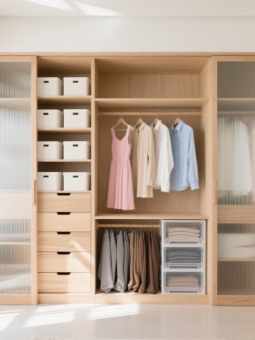 一个精心整理的现代简约风格衣帽间,浅木色开放式柜体,顶部搁板放置白色收纳盒,中间挂杆悬挂多件白色衬衫、浅色上衣和连衣裙,下方层板整齐叠放白色毛巾,旁边堆叠两个银色复古手提箱,底部配有白色抽屉柜,整体布局井然有序,自然光柔和照亮空间,营造出干净整洁、温馨舒适的居家氛围,衣物材质细节清晰,光影层次柔和自然。