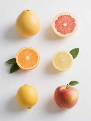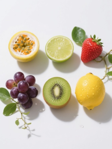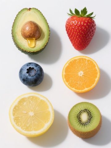 纯白色背景上,六个水果元素规整排布成系列素材集合,每个水果都以高度写实的摄影风格呈现,具有清晰的纹理细节、自然的光影过渡和高饱和度的色彩。左侧从上到下依次为:半个牛油果,果核完整,表面光滑的绿色果皮带有细密凸起,切开的果肉呈现淡黄绿色,一颗金黄色的蜂蜜滴落其上,蜂蜜具有透明的光泽和粘稠的质感;一个完整的蓝莓,深蓝色的表皮带有自然的果粉,顶部有细小的果蒂,球体饱满且富有弹性。右侧从上到下依次为:一个被切开的橙子,橙皮呈现鲜艳的橙黄色,带有明显的凹凸纹理,果肉瓣清晰可见,颗粒饱满,汁水欲滴;一个草莓,鲜红色的果实表面布满黄色的籽粒,顶部绿色的叶子呈现锯齿状,果实底部微微内凹;一个猕猴桃,被切成两半,棕色的果皮上覆盖着细密的绒毛,绿色的果肉中分布着黑色的籽粒,截面光滑;一个柠檬,一半被切开,黄色的果皮光滑且带有油点,果肉呈现淡黄色,白色的筋络清晰可见。所有水果元素保持统一的光照方向,阴影自然柔和,整体构图平衡对称,每个水果都占据相似的空间大小,共同营造出清新、健康的视觉氛围,具有强烈的设计感和信息传达效率,适合作为健康食品或饮品的宣传素材。