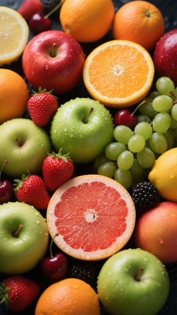 白色纯色背景上,以超写实主义风格呈现的6个完全不同的水果元素系列素材集合,每个元素均保持与原图一致的高细节质感、水润光泽表现、自然光影处理和规整排布方式:1. 一串饱满的红提,紫红色果皮带有光泽和水珠,附带绿色叶子和藤蔓;2. 一个完整的哈密瓜,橙黄色果皮带有绿色条纹,切开一半露出橙红色果肉和黑色种子;3. 一串香蕉,黄色果皮带有褐色斑点,自然弯曲的形态,顶部保留绿色果柄;4. 一个苹果,红色果皮带有黄色渐变,表面光滑有光泽,附带一片绿色叶子;5. 一串草莓,红色果肉表面布满黄色种子,顶部带有绿色草莓叶,呈现自然堆叠状态;6. 一个菠萝,黄色果皮带有菱形鳞片和绿色叶子,表面纹理清晰可见。所有元素均保持相同的光影方向、细节刻画程度和水润质感,整体布局规整对称,形成统一协调的水果系列素材集合。
