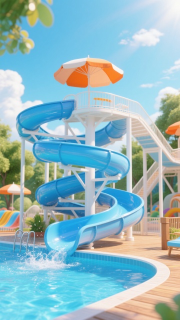 色彩明快的卡通风格水上乐园全景图,以绿色为主色调,搭配橙色、黄色、蓝色等鲜亮色彩,营造出欢乐活泼的氛围。画面中充满了各种可爱的黄色小鸭子角色,它们在不同的水上设施中嬉戏:有的从橙色螺旋滑梯滑入水中,有的在蓝色泳池里游泳,有的坐在粉色游泳圈上漂浮,还有的在绿色草地上休息。水上乐园设施丰富多样,包括大型橙色螺旋滑梯、蓝色直滑梯、红色水桶倒水装置、瀑布、圆形泳池、漂流河道等,周围环绕着高大的绿色松树和棕榈树,点缀着遮阳伞、躺椅、小桌子等休闲元素。整体构图饱满,细节丰富,线条圆润流畅,充满童趣和夏日清凉感,展现出一个热闹非凡、充满欢声笑语的水上乐园场景。