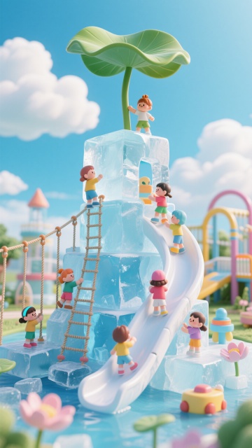一系列4个不同内容的3D卡通风格儿童夏日活动插画,保持低多边形圆润造型、明亮柔和光影、高饱和度色彩和光滑材质质感,每个元素独立置于纯色背景上并规整排布;第一个画面:穿着黄色条纹上衣和蓝色短裤的男孩戴着橙色泳镜,躺在蓝白相间的游泳圈上开怀大笑,双手举起泳镜,双腿自然伸直;第二个画面:穿着粉色连衣裙的小女孩戴着粉色蝴蝶结发箍,坐在黄色充气鸭子游泳圈里,手里拿着一个红色草莓冰淇淋,面带微笑看向一侧;第三个画面:穿着绿色短袖和白色沙滩裤的小男孩戴着蓝色太阳帽,站在紫色冲浪板旁,手里拿着黄色沙滩铲,脚下踩着白色沙滩,表情兴奋;第四个画面:穿着橙色泳衣的小女孩戴着紫色浮袖,坐在粉色充气独角兽游泳圈上,手里拿着一个黄色小水桶,水面上漂浮着蓝色小鸭子玩具,笑容灿烂。