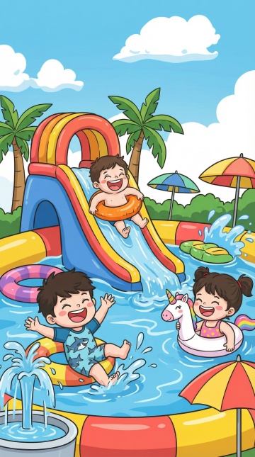 清新卡通3D风,充气大字“夏天”漂浮泳池,热带植物环绕,夏日派对氛围。