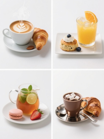 高分辨率摄影风格,纯白纯色背景,6个完全不同的烘焙元素规整排布成系列素材集合,每个烘焙元素都具有金黄诱人的色泽、清晰的纹理细节和饱满的形态,包含:1. 堆叠的牛角面包,表面呈焦糖色,层次分明;2. 撒有糖粉的圆形草莓挞,挞皮酥脆,顶部点缀新鲜草莓;3. 切片的肉桂卷,螺旋状结构清晰可见,表面淋有光泽的糖霜;4. 法棍面包,长条形,表面有自然裂纹,呈现经典的金黄色;5. 巧克力丹麦酥,酥皮层次丰富,内嵌巧克力块,边缘微焦;6. 圆形的黄油曲奇饼干,表面有网格花纹,色泽均匀,具有烘焙食品特有的质感和立体感,整体光影统一,突出食物的新鲜感和美味,适合商业海报或产品展示使用。