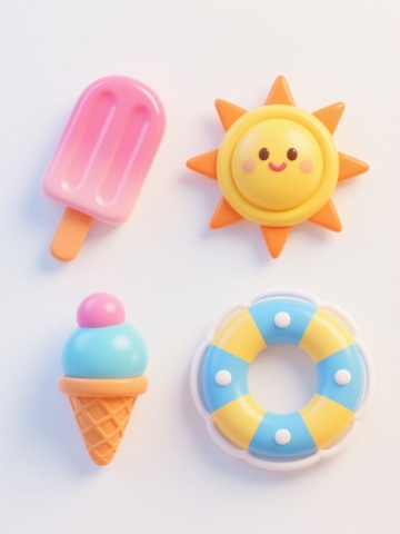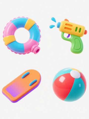 一套4个不同夏日水上玩具的3D渲染图标,保持圆润可爱的卡通风格,每个玩具具有光滑的塑料质感和明亮的渐变色彩,包含充气游泳圈、喷水枪、浮板和水上排球,元素类目不变,整体色彩变换为不同的马卡龙色系组合,每个玩具独立置于纯色背景上,4个图标呈2x2网格规整排布,画面简洁明快,充满夏日活力,无文字和二维码。