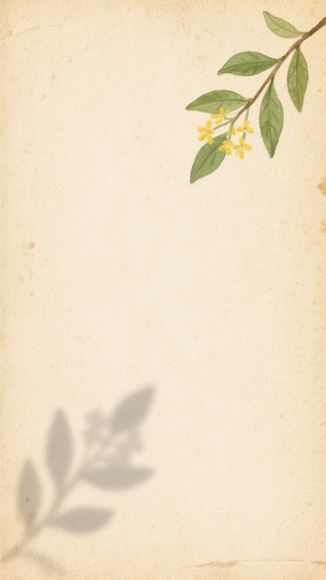 暖色调背景,带有明显纹理的米黄色纸张质感,纸张上有细微的斑驳和污渍效果,右上角有一枝清晰的绿色枝叶和黄色小花图案,左下角有一个模糊的灰色枝叶剪影,整体呈现出淡雅、自然、复古的手绘风格,画面简洁,留白充足,营造出宁静、温馨的氛围。