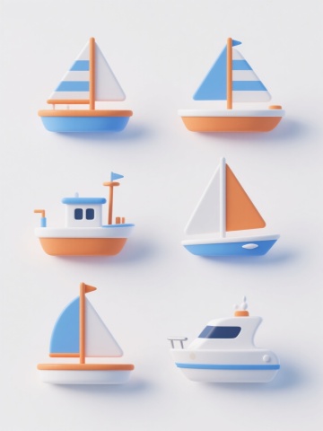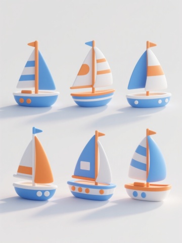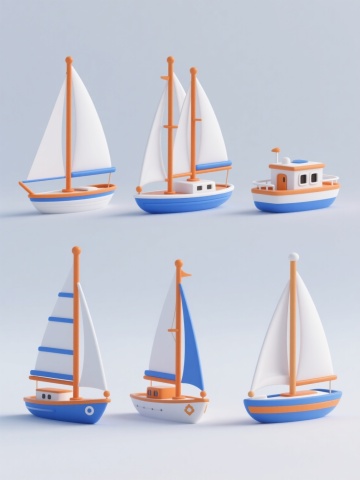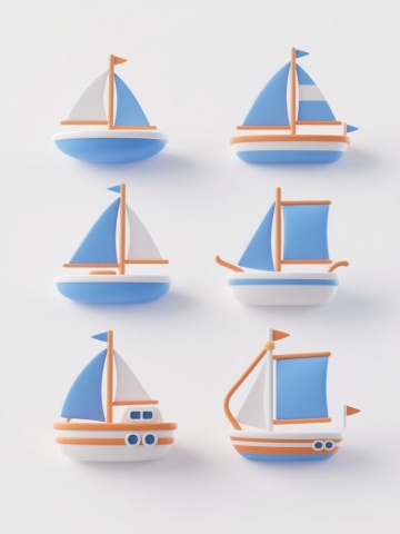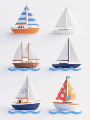 白色纯色背景上,六个造型完全不同的3D立体风格帆船元素系列素材集合,规整排布成两行三列。每个帆船保持3D立体质感,具有平滑的曲面、微妙的光影过渡和清晰的结构轮廓。帆船造型包括:1. 橙色船体配蓝白条纹帆的休闲游艇,带驾驶舱细节;2. 白色简约单桅帆船,风帆呈优雅的三角形展开;3. 复古双桅帆船,棕色木质船体配多面白色风帆;4. 现代流线型竞赛帆船,低矮船体配巨大主帆;5. 带有圆形舷窗的探险帆船,船体为深蓝色,白色风帆带航海图案;6. 卡通风格帆船,船身圆润,风帆色彩鲜艳有波点图案。每个帆船下方都有简洁的蓝色波浪线条装饰,整体保持统一的3D立体风格和清新明快的视觉氛围,所有元素排列整齐有序,形成和谐的系列感。