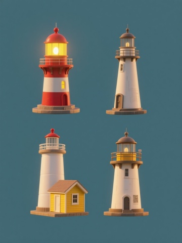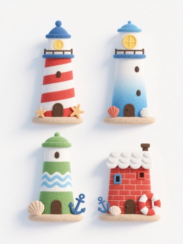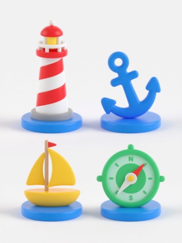 一套4个不同海洋主题元素的3D卡通风格图标集合,保持与参考图一致的低多边形设计、圆润边角、鲜艳明快色彩方案(主色调为红色、白色、蓝色、橙色)和光滑材质质感,元素分别为灯塔、帆船、锚、海浪,每个元素独立置于纯白色背景上,4个图标呈2x2网格规整排布,整体风格统一、可爱童趣,适合儿童相关或海洋主题的UI设计、插图或教育素材使用。