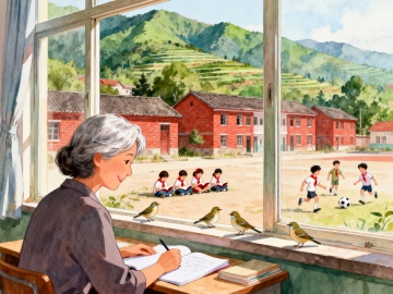 水彩风插画,柔和色调描绘乡村校园日常,窗外童趣嬉戏与窗内静谧书写交织,质朴温馨中流淌故事感。