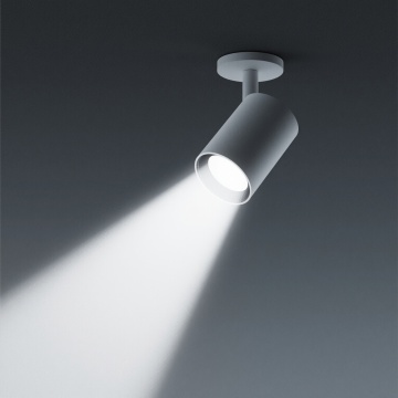 极简风格的射灯设计插图,单个筒状射灯安装在深灰色背景的顶部中央,发出强烈的白色锥形光束,光线明亮且边缘柔和,光束从顶部向下呈放射状均匀扩散,照亮下方区域,背景为纯深灰色渐变,无其他装饰元素,整体营造出简洁、专业、聚焦的氛围,光影对比鲜明,射灯形态简约现代,突出其照明功能和工业设计感。