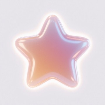 一个具有3D立体效果的五角星,整体呈现光滑的果冻质感,表面有细腻的光泽和微妙的渐变,边缘圆润柔和,中心到边缘有自然的色彩过渡,周围环绕着一圈明亮的发光效果,光晕均匀扩散,背景为纯白色,干净简洁,突出主体五角星的立体感和光泽感。