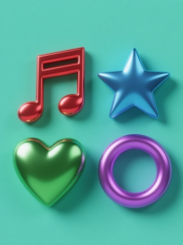 立体3D风格设计,纯色背景,画面中规整排布四个完全不同的几何元素,分别为三角形、正方形、圆形和五角星,每个元素均采用从蓝绿色到粉色的渐变色彩,具有光滑的曲面和清晰的边缘转折,呈现出鲜明的立体感和现代设计感,整体构图平衡对称,视觉层级清晰,符合简洁的海报设计风格,能够高效传达几何元素的视觉信息。