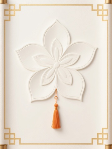 一张具有传统中式风格的卷轴状证书设计,采用米白色纯色背景,中央以浅淡浮雕效果呈现一朵抽象的五瓣花朵图案,花瓣边缘有细腻的线条勾勒。卷轴边缘装饰有金色的几何边框,四角为方形回纹纹样,底部中央悬挂着一个橙色的流苏吊坠。整体设计简洁典雅,具有浓厚的东方文化韵味和正式感,视觉层次分明,留白恰到好处,营造出庄重而雅致的氛围。