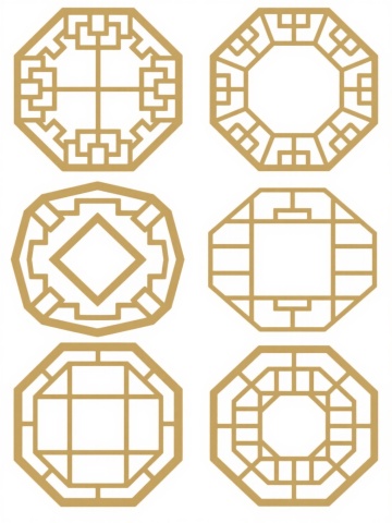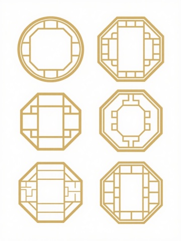一组不同配色与样式的中式边框设计集合,白色背景,包含多种几何形状的边框:上方为两个水平长条形边框,左侧为黑色细线勾勒,四角有简约方形纹饰,右侧为金色细线条,四角带有回纹装饰;中间部分是两行各三个方形边框,上行三个为黑色线条,边框四角装饰有传统中式纹样,纹样复杂度略有不同,下行三个为金色线条,同样在四角有精致的回纹和几何图案;底部则是两个特殊形状边框,左侧为黑色线条勾勒的八边形如意纹边框,边缘有连续的波浪形和对称花卉图案,右侧为金色圆形边框,边缘环绕着细密的连续回纹和点状装饰,所有边框线条均匀流畅,图案对称工整,具有浓厚的中国传统装饰风格,整体设计简洁大方,适合作为各类设计作品的装饰性框架使用。