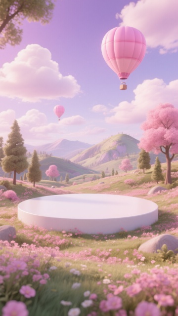 画面中心是一个粉色展台,展台为圆形,底部是粉色的,顶部是浅蓝色的。展台周围是绿色的草地,草地上开满了粉色的花朵。背景是粉色的天空,天空中有许多粉色的云朵,远处是绿色的山丘,山丘上也开满了粉色的花朵,山丘之间有一条小河。整个画面充满了春天的气息,色彩柔和,给人一种温馨、浪漫的感觉。