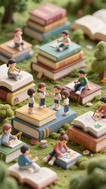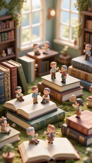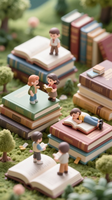 清新卡通3D风,微缩艺术展现书海中的童趣世界,生动可爱。