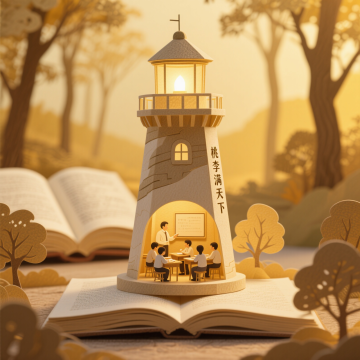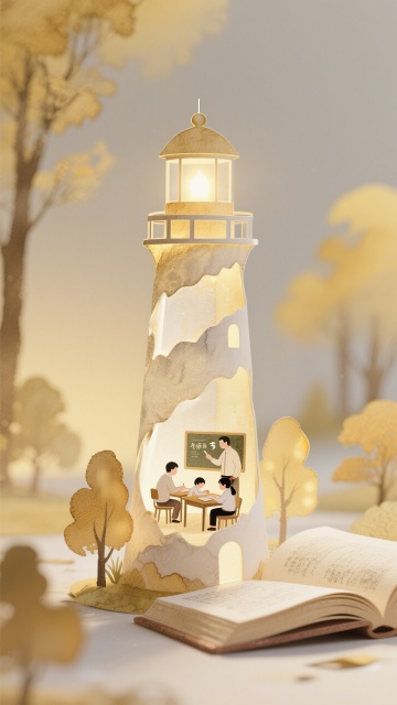 文艺感插画风,剪纸艺术展现教师节温馨场景,灯塔内师生互动,书香弥漫。
