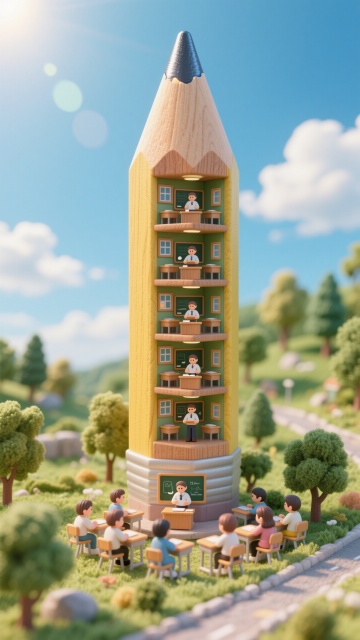 3D微缩艺术风,铅笔造型学校,清新卡通感,超现实主义设计,展现教育创意。