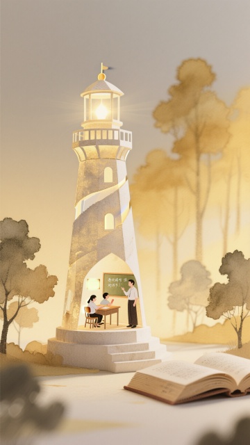 文艺插画风,微缩艺术展现灯塔内课堂情景,温暖灯光映衬书香氛围。