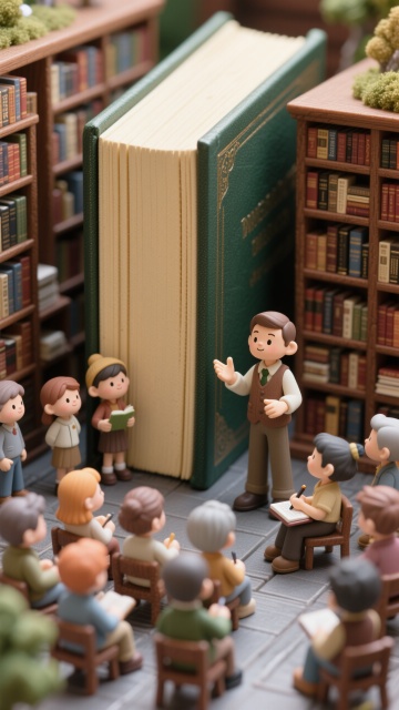 可爱卡通3D风,微缩艺术展现超现实主义书本世界,人物在书页间互动,充满童趣与想象力。