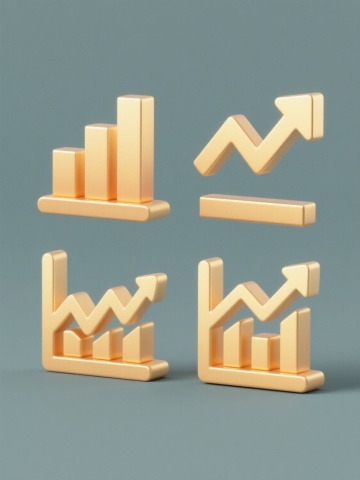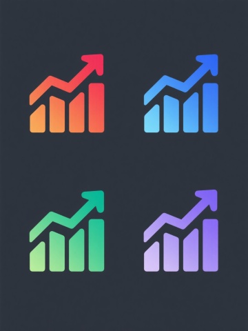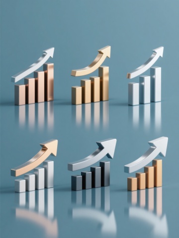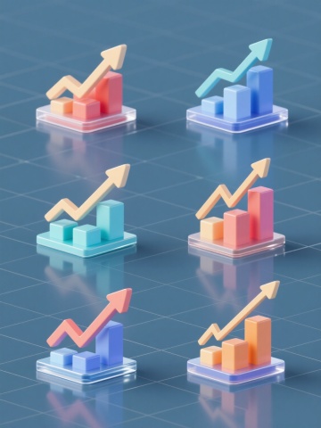 一系列四个规整排布的3D数据图表设计,每个图表均包含从左到右逐渐增高的3D柱状图和一条从左下角延伸至右上角的向上3D趋势线,所有图表元素的形状、比例和构图保持一致,整体呈现协调统一的视觉效果。第一幅图表,橙色系3D柱状图与红色系3D趋势线搭配白色背景;第二幅图表,蓝色系3D柱状图与深蓝色3D趋势线搭配浅蓝色背景;第三幅图表,绿色系3D柱状图与深绿色3D趋势线搭配浅绿色背景;第四幅图表,紫色系3D柱状图与深紫色3D趋势线搭配浅紫色背景,具有清晰的视觉层级,信息传达高效,设计感强。
