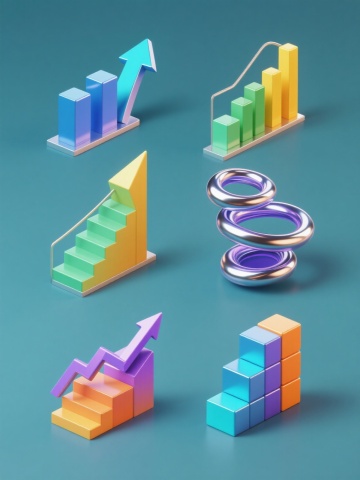 3D立体风格金融元素插画,浅色背景,上下两行对齐排列六个不同配色、不同样式、不同材质的金融相关元素,整体采用柔和渐变色彩,光影明亮柔和,高光清晰,阴影细腻自然,物体边缘平滑圆润,具现代简约设计感,每个元素细节丰富,材质质感鲜明,第一行从左到右依次为:金色硬币堆叠造型,表面有货币符号浮雕,金属光泽质感;蓝色渐变信用卡,带有芯片和磁条细节,光滑塑料材质;绿色柱状图表,立体几何形态,半透明亚克力质感,第二行从左到右依次为:红色上升箭头,流线型设计,磨砂金属材质;紫色银行存折,带有折叠细节和纸张纹理,哑光纸质材质;橙色储蓄罐,卡通造型,光滑陶瓷材质,所有元素独立清晰,布局均衡有序,整体视觉统一和谐。